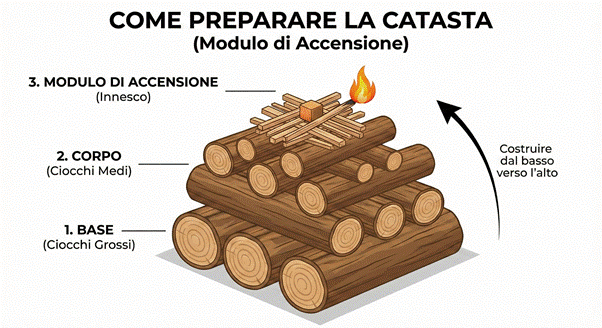 Il principio è costruire una catasta stabile e ben aerata, che permetta all’aria di circolare e alla fiamma di svilupparsi dall’alto verso il basso: