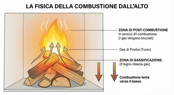 In pratica, l’aria calda e le fiamme non riescono subito a salire e a coinvolgere tutta la massa di legna, e gran parte dei fumi prodotti non passa attraverso una zona sufficientemente calda dove potrebbe bruciare meglio. Questo spiega perché, nelle “accensioni da sotto”, spesso vediamo un fumo scuro e persistente fuoriuscire dalla canna fumaria prima che il fuoco si stabilizzi.