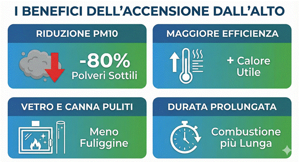Dal punto di vista ambientale, una combustione corretta e “pulita” porta a una riduzione del particolato (PM10) nel riscaldamento domestico fino all’80%, infatti la combustione inefficiente contribuisce in modo significativo alle concentrazioni di polveri sottili nelle zone urbane e montane durante l’inverno. Tecniche come l’accensione dall’alto riducono la formazione di fumi densi visibili e le emissioni di particolato, migliorando così la qualità dell’aria nelle nostre case e all’esterno.