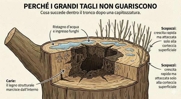 Un’altra conseguenza critica delle ferite provocate dalla capitozzatura è l’esposizione dei tessuti interni. A differenza di come spesso si pensa, un albero non cicatrizza come un animale; piuttosto compartimenta il danno isolando le zone lese. Tagli massicci e superfici di legno esposte favoriscono l’ingresso di funghi e altri agenti patogeni, portando a fenomeni di carie del legno e marcescenza che possono svuotare il tronco dall’interno e indebolire la struttura complessiva, aumentando così l’instabilità dell’albero.