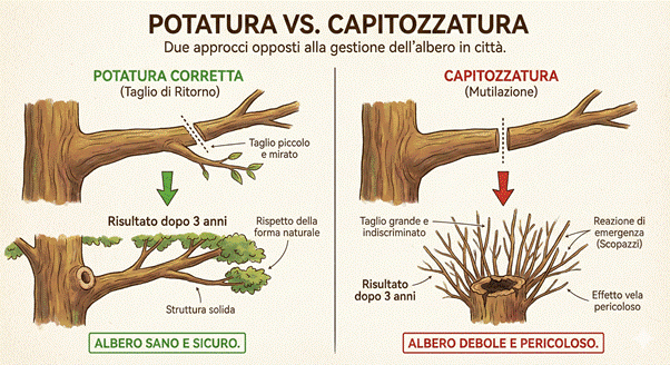 Capitozzatura o taglio di ritorno: conoscere le differenze è fondamentale per la sicurezza urbana. Scopri come potature errate possono danneggiare gli alberi, aumentare i rischi di cedimenti e far lievitare i costi di manutenzione, e perché la tecnica corretta protegge la salute e la longevità delle piante.