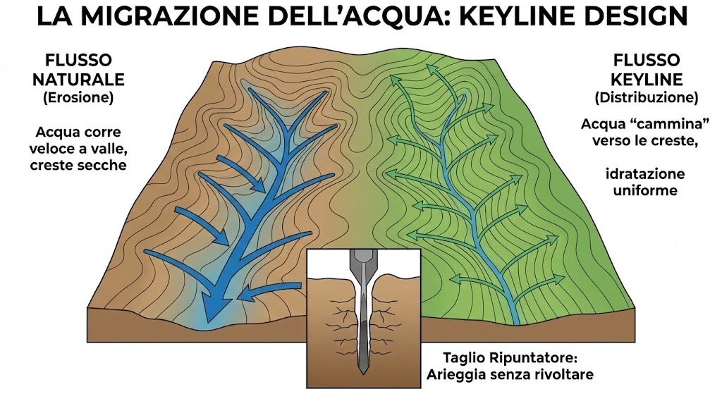 Dal momento che il Keyline Design non è solo una tecnica di aratura, ma rappresenta una filosofia di custodia del territorio, per realizzare il suo disegno in maniera corretta occorre uno strumento più delicato, quasi chirurgico. La siccità e l’erosione non sono esclusivamente fatalità meteorologiche, ma rappresentano spesso il risultato di una geometria sbagliata. Cambiando il modo in cui gestiamo i nostri campi, possiamo trasformare ogni pioggia in un toccasana per il paesaggio.
