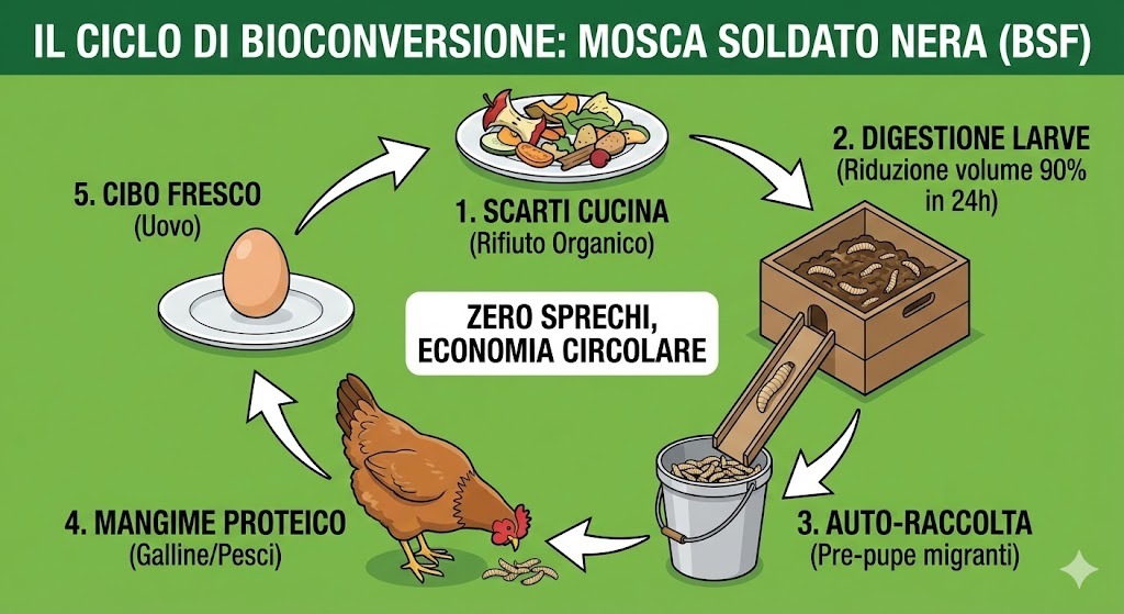 Mentre le mosche comuni si posano sui piatti serviti in tavola, infastidendoci poiché foriere di batteri, la mosca soldato adulta si comporta in tutt’altra maniera, dal momento che non ha nemmeno l’apparato boccale. È una specie che non mangia, non punge e vive solo pochi giorni, con un unico scopo: la riproduzione. Il cuore pulsante del suo ciclo vitale è la fase intermedia, quella della larva: essa costituisce una macchina digestiva insaziabile, capace di compiere un vero e proprio miracolo di bioconversione dei rifiuti organici.