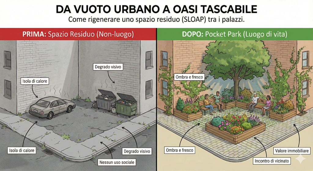 Non di rado, questi spazi finiscono per diventare ricettacoli di degrado. Eppure, sarebbe davvero semplice, in fase progettuale, trovare una collocazione per delle piccole aree verdi, le quali diverrebbero rapidamente risorse preziose per la cittadinanza. Trasformare uno SLOAP in parco tascabile significa eliminare un buco nero urbano, covo di sporcizia, e restituirlo alla comunità, regalandole un angolo utilizzabile in tutte le stagioni e che tuteli la biodiversità.