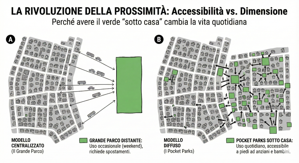 | Distanza e accessibilità | Richiede l’uso di mezzi di trasporto pubblici o privati per essere raggiunto, limitandone la frequenza d’uso. | La sua collocazione sotto casa, o quasi, lo rende raggiungibile a piedi, in pochi minuti. | Favorisce l’uso quotidiano, l’attività fisica spontanea e riduce la necessità di spostamenti, contribuendo a una mobilità più sostenibile. È un elemento di miglioramento immediato della qualità della vita. |