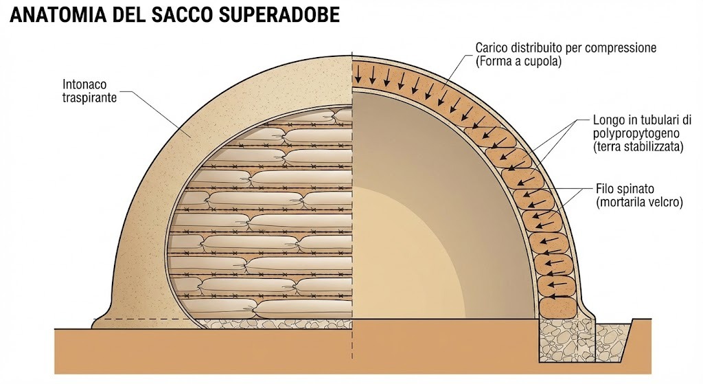 Costruire in Superadobe è un processo che si può definire passivo e trasforma la terra umida in roccia artificiale attraverso pochi e semplici passaggi. Si comincia con il riempimento. Si utilizzano lunghi sacchi tubolari di polipropilene, simili a quelli per il riso, colmati di terra locale, stabilizzata con una piccola percentuale di calce o cemento, che non superi il 5-10% del totale. Questa componente serve a rendere il tutto resistente all’acqua. Tra uno strato di sacchi e l’altro si stendono due filari di filo spinato. Esso agisce come un micidiale velcro antisismico, impedendo ai sacchi di scivolare e garantendo una coesione strutturale incredibile, specialmente se sottoposti a stress dovuto a terremoto.