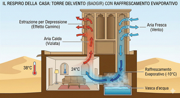 Dall’antica architettura bioclimatica persiana alle applicazioni moderne, il Badgir combina ventilazione naturale passiva e raffrescamento evaporativo per un comfort termico sostenibile ed efficiente.