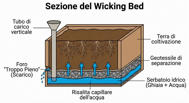 Quando si decide di costruire un wicking bed, bisogna pensare al sistema come a una piccola infrastruttura sotterranea progettata per il risparmio idrico dell’orto e per migliorare la resa della coltivazione in cassoni o in un vero e proprio orto rialzato autoirrigante.